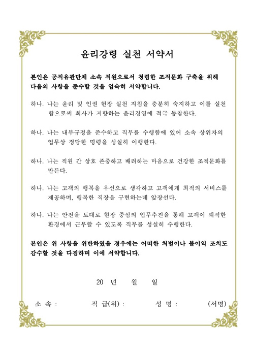청렴하고 공정한 회사를 실현하는데 모범이 될 것을 서약하였습니다.