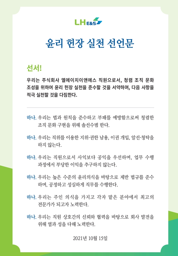 주식회사 LH E&S의 임직원이 준수하여야 할 행동의 기준을 규정하여 시행하고 있습니다.